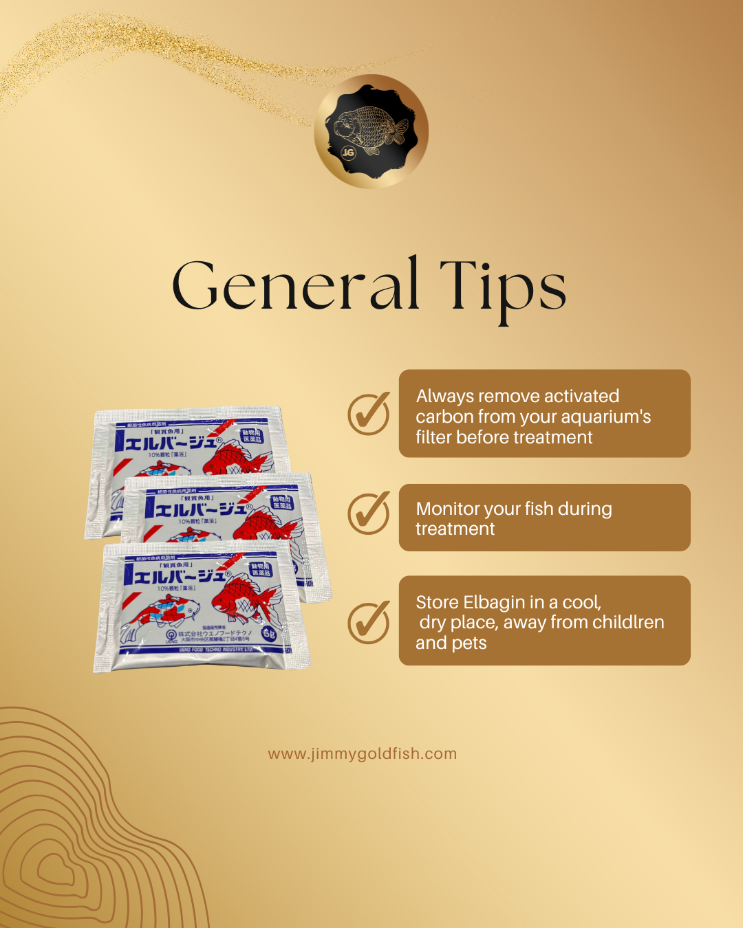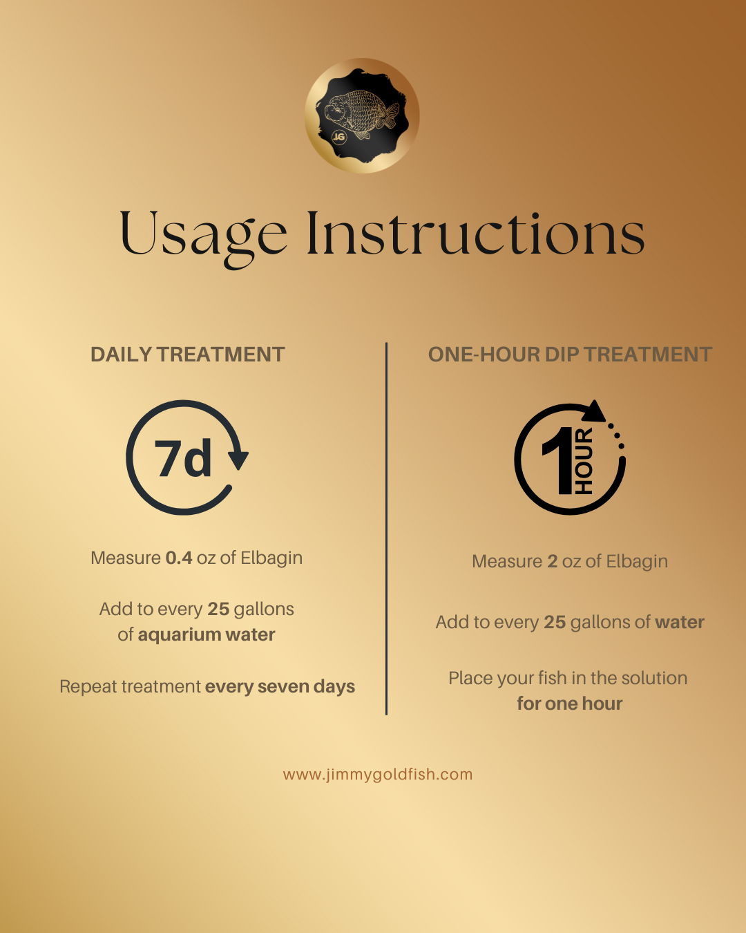 Tenga en cuenta: siga siempre las instrucciones de dosificación y guárdelo en un lugar fresco y seco, fuera del alcance de los niños y las mascotas. Si bien respaldamos la eficacia y la seguridad de Elbagin, no nos hacemos responsables de ningún daño causado debido a un uso incorrecto. Es esencial seguir las instrucciones proporcionadas con precisión y consultar con un profesional de la salud de los peces si es necesario. El uso incorrecto que provoque efectos adversos en sus peces no será responsabilidad de nuestra marca.